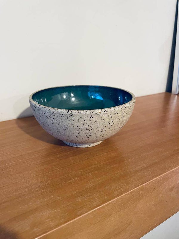 Een rond kommetje met een voetje. Gemaakt om dagelijks te gebruiken.